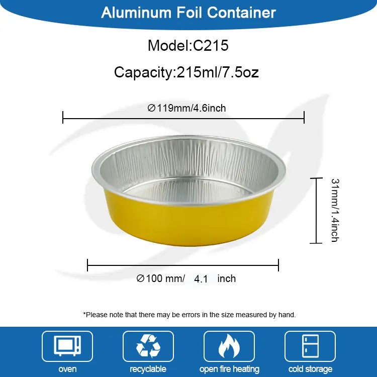 Pembungkusan baking pembungkusan buang buang smoothwall aluminium foil, atas: 110mm, 4.3 ", bawah 100mm, 4", ketinggian: 31mm 1.2 ", memegang 215ml/8.5oz. Keperluan pembungkusan makanan, telah disahkan oleh pasaran dan telah diiktiraf secara meluas oleh pelanggan dan kilang.