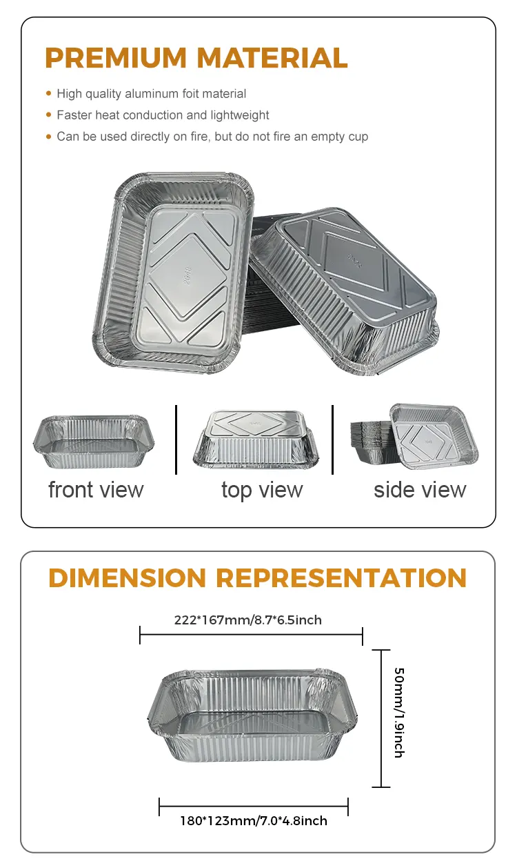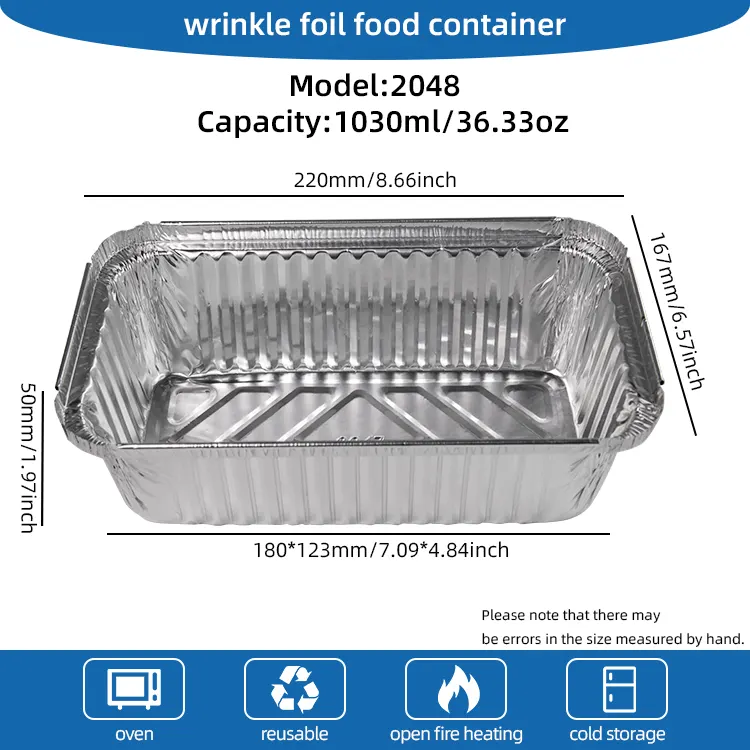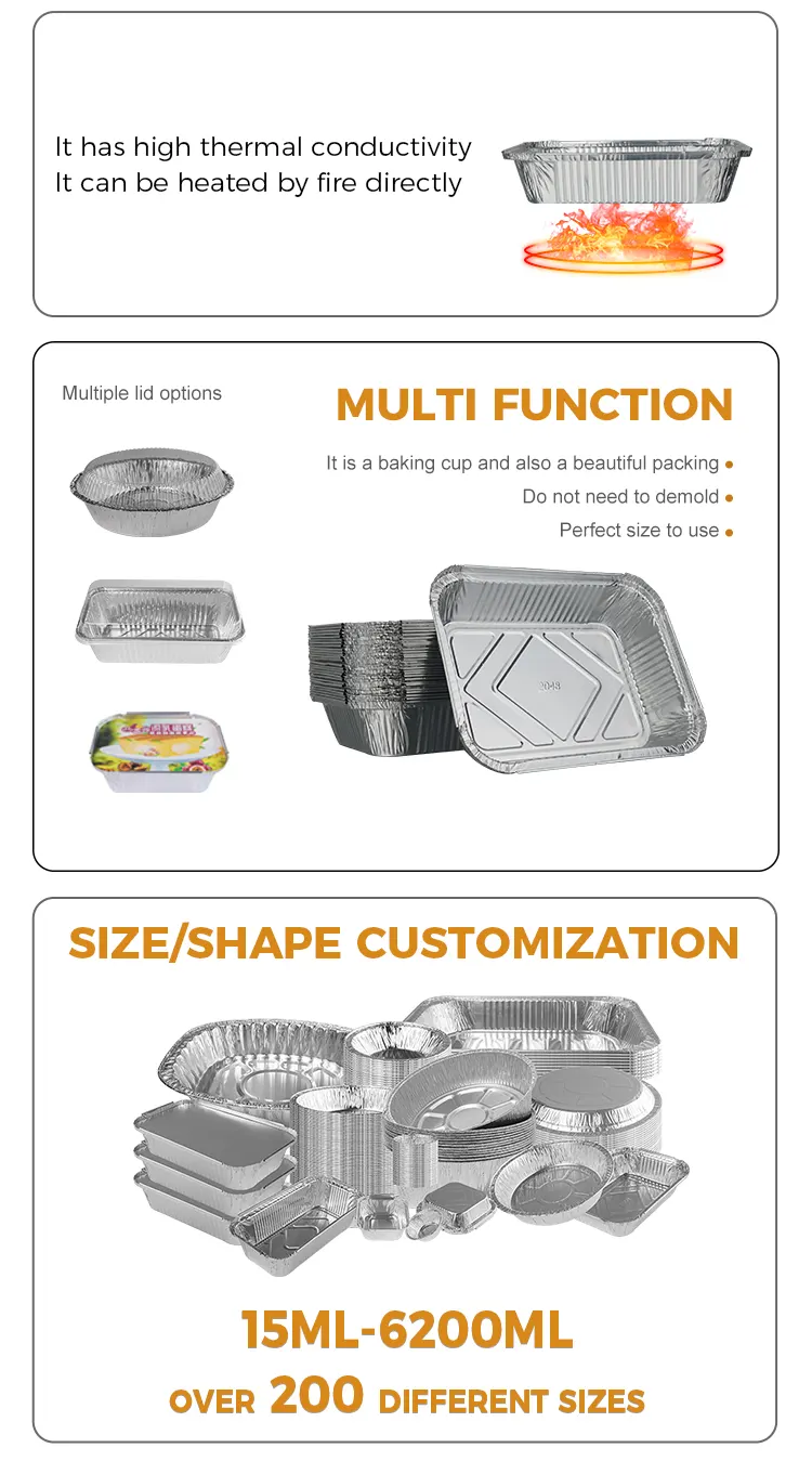 Kotak makan tengah hari pembakar barbeku boleh guna Kilang Aluminium Foil Yunchu bekas kerajang aluminium perak diperbuat daripada kerajang aluminium gred makanan ketulenan tinggi. Ia tidak toksik dan tawar, tahan terhadap suhu tinggi dan suhu rendah. Takat lebur setinggi 250°C. Ia boleh bersentuhan langsung dengan makanan. Ia tidak melepaskan bahan berbahaya apabila dipanaskan pada suhu tinggi. Ia juga boleh mengekalkan bentuk yang stabil apabila disejukkan dan dibekukan. Ia adalah reka bentuk sekali sahaja dan boleh dibuang selepas digunakan. Tidak perlu menghabiskan masa membersihkan pinggan dan kuali pembakar, menyahtoksik sepenuhnya Ia menyelesaikan masalah pembersihan yang membosankan selepas makan, dan amat sesuai untuk adegan seperti perhimpunan dengan ramai orang dan perjalanan luar. Bahan kerajang aluminium tebal yang dinaik taraf mempunyai tekstur pepejal dan kapasiti sokongan yang kuat. Ia tidak mudah bocor atau berubah bentuk apabila memegang hidangan dengan sup atau bahan barbeku berat. Bahagian tepinya licin dan bebas burr, menjadikannya lebih selamat untuk digunakan. Ia juga sesuai untuk ketuhar, penggoreng udara, pengukus dan peralatan dapur lain, dan memasak dan menghidang boleh dilakukan dalam satu langkah.