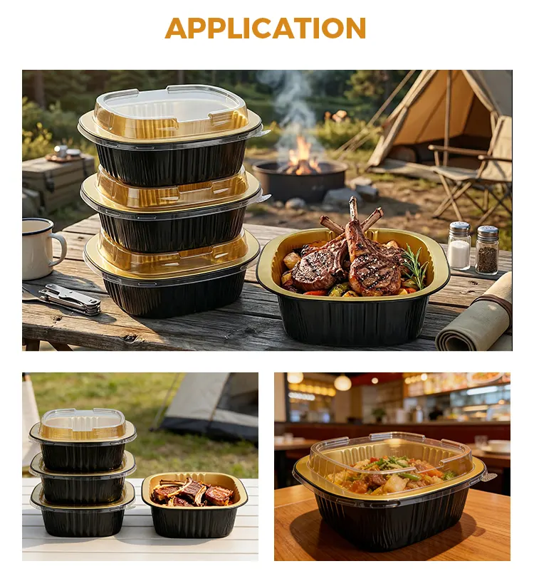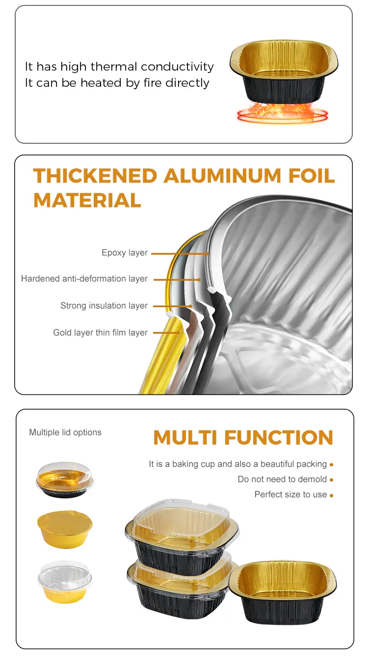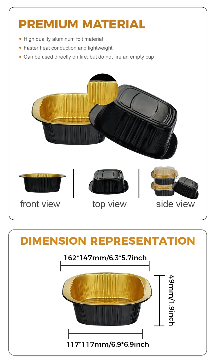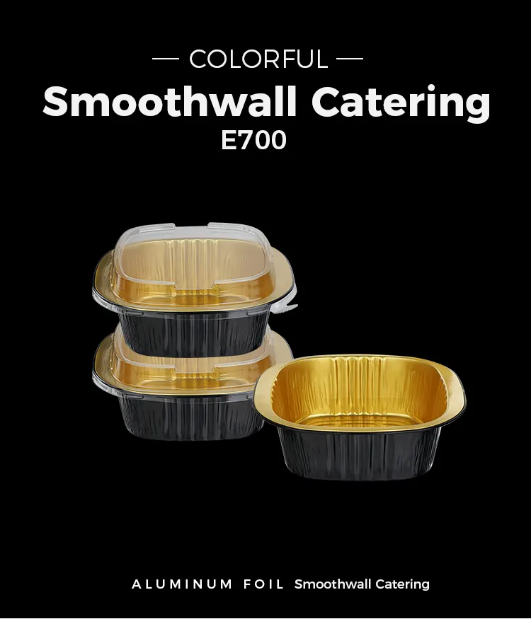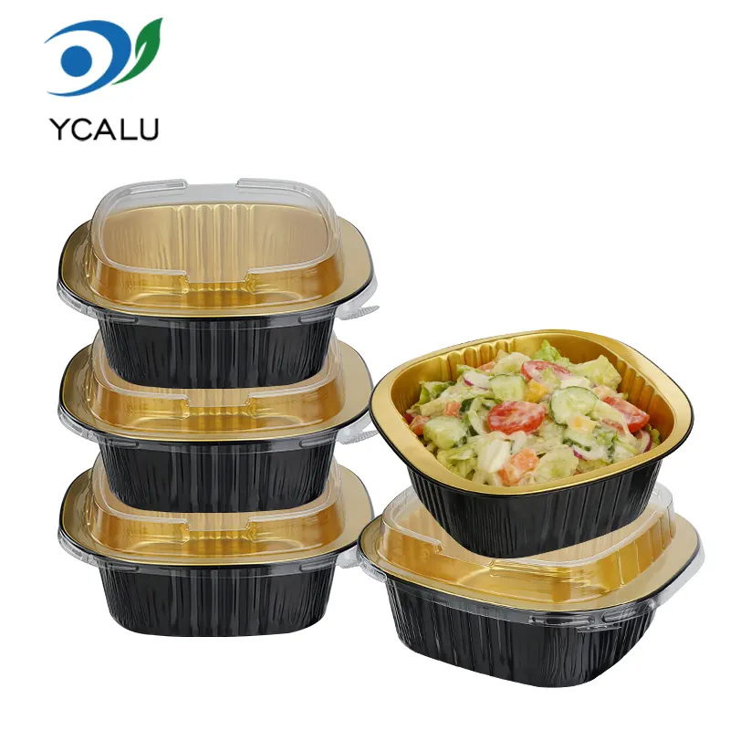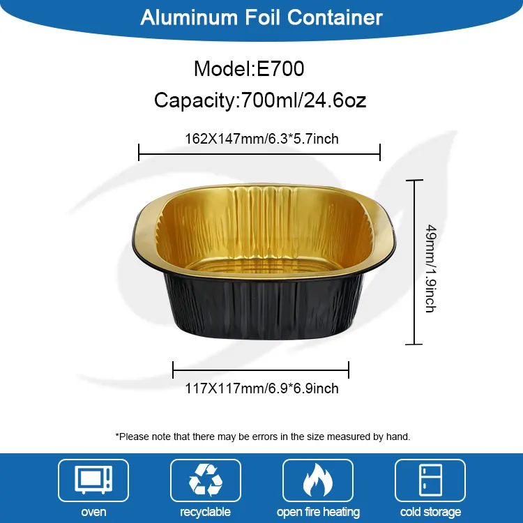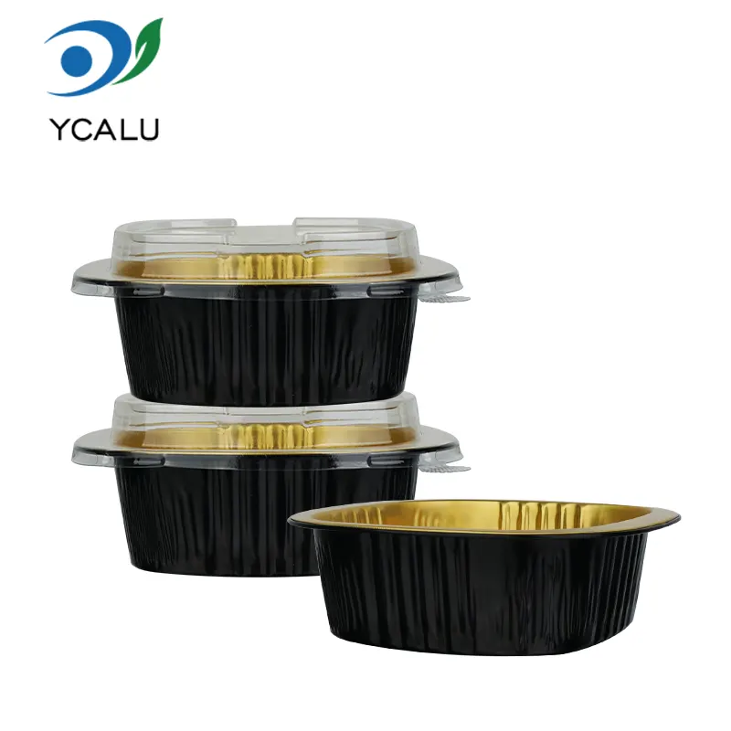 ​Pembekal Yunchu Aluminium Foil Kotak segi empat sama binaural pakai buang emas hitam berdinding cahaya kerajang aluminium diperbuat daripada kerajang aloi aluminium 8011 gred makanan. Mereka telah dirawat dengan proses penyepuhlindapan dan pensterilan suhu tinggi untuk membentuk lapisan oksida padat di permukaan. Mereka tidak mempunyai logam berat dan tidak berbau. Mereka boleh berhubung terus dengan semua jenis makanan dan menghalang pemendakan bahan berbahaya pada suhu tinggi. Sama ada ia digunakan untuk menyimpan hidangan panas, hidangan sejuk, pencuci mulut atau sos, ia boleh melindungi keselamatan makanan dan mematuhi pelbagai pensijilan keselamatan seperti FDA dan SGS, menjadikan setiap gigitan lebih selamat. Reka bentuk dinding cahaya emas hitam yang unik memecahkan tekstur monoton bekas kerajang aluminium tradisional. Salutan emas hitam matte dan permukaan dinding licin membawa rasa mewah. Bukan sahaja ia mempunyai penampilan yang luar biasa, ia juga boleh menyekat cahaya dan oksigen dengan berkesan, melambatkan pengoksidaan makanan, mengunci dengan kuat aroma dan kelembapan makanan, mengelakkan pemindahan bau, dan mengekalkan rasa asli makanan untuk masa yang lama. Permukaan dinding yang licin tidak mempunyai alur atau kedutan, menjadikannya kurang berkemungkinan membiak bakteria dan mudah dibersihkan. Ia juga boleh menyesuaikan diri dengan penyesuaian pencetakan dengan lebih baik, membantu jenama katering untuk meningkatkan pengiktirafan dan kualiti mereka.