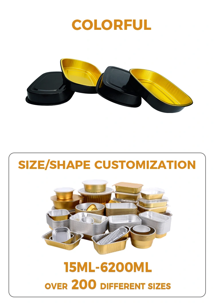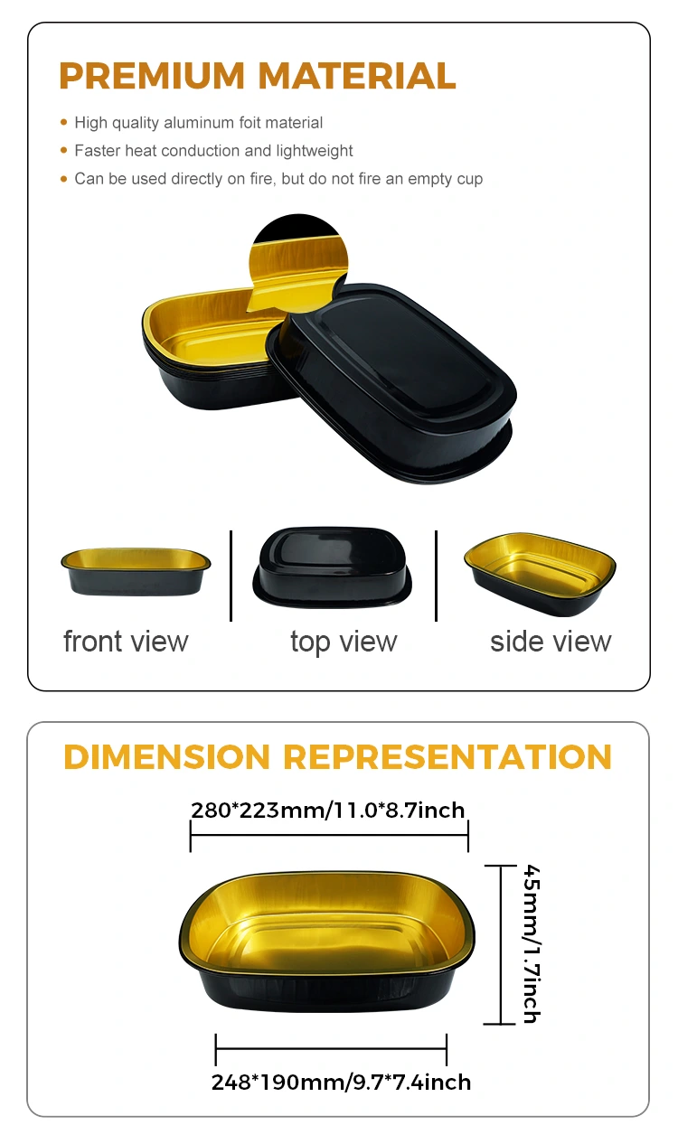 Pembekal aluminium Yunchu Pembekal Black Gold Catering Catering Rectangular Aluminium Foil Containers sesuai untuk pelbagai orang atau hidangan tunggal atau senario makan layan diri, terutamanya sesuai untuk pembungkusan hidangan seperti gratin atau pasta panggang. Produk ini juga sesuai untuk pembungkusan kotak makan tengah hari, katering dan takeaway, serta pembungkusan selektif hidangan yang disediakan. Bekas ini diperbuat daripada kerajang aluminium makanan berkualiti tinggi, yang selamat dan bebas bau, dan memenuhi piawaian hubungan makanan antarabangsa. Apabila digabungkan dengan filem pengedap haba, ia dapat mencapai pengedap yang cekap dan berkesan menghalang kebocoran sup, menjadikannya sesuai untuk peralatan pengedap automatik. Bekas mempunyai permukaan yang licin dan rata untuk pelabelan mudah dan penampilan yang indah yang membantu meningkatkan imej jenama. Ia tahan terhadap suhu tinggi dan rendah, boleh digunakan dalam julat suhu -20 ° C hingga 250 ° C, dan menyokong pelbagai kaedah pemanasan seperti penyejukan, baking, dan mengukus. Bahan foil aluminium adalah 100% boleh dikitar semula dan memenuhi keperluan pembangunan mampan.