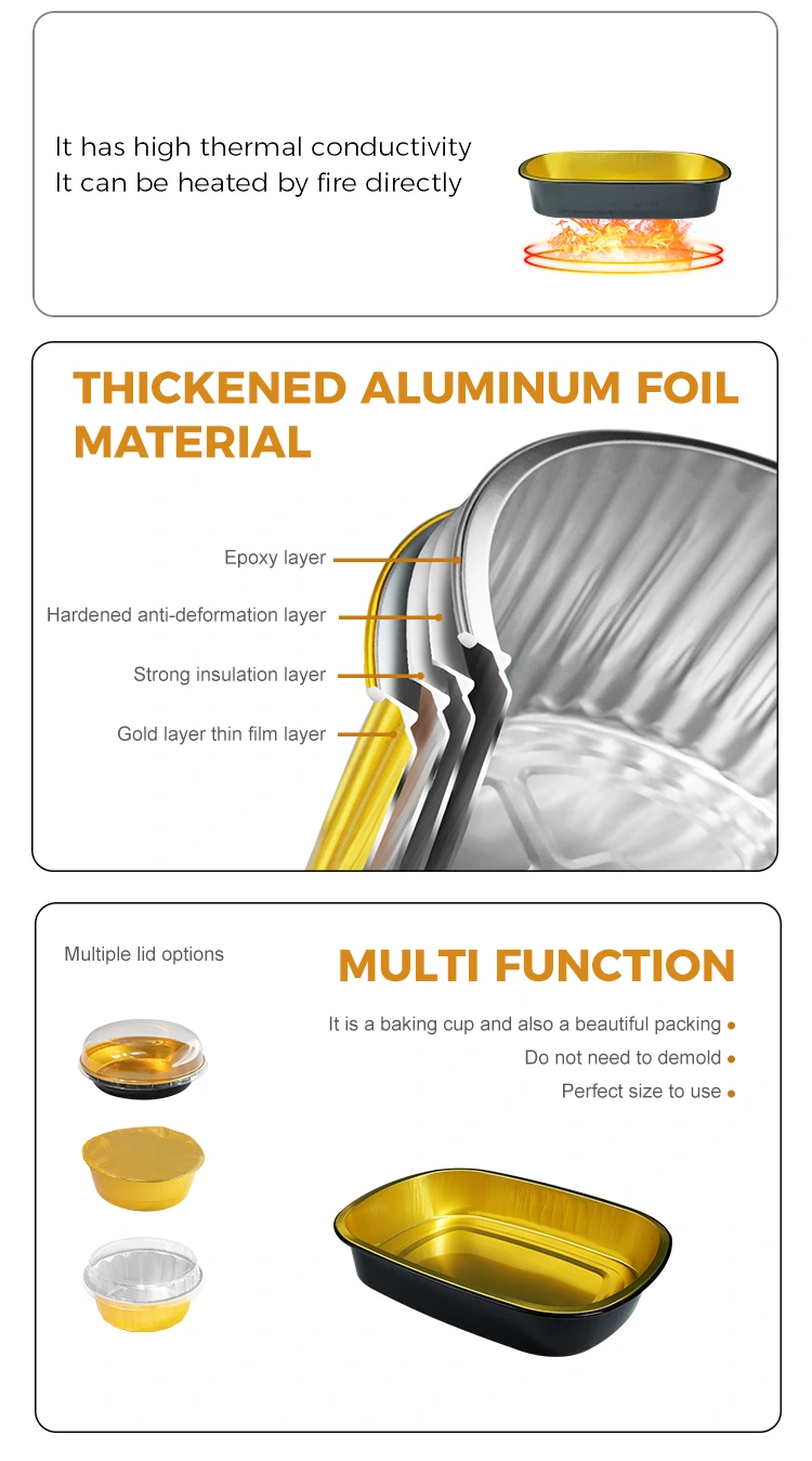 Pembekal foil aluminium Yunchu yang boleh dibuang emas hitam yang boleh dibuang oleh aluminium aluminium aluminium yang sesuai untuk katering besar-besaran dan industri-industri yang boleh dibuang, yang lain dan lain-lain. Tempat, boleh digunakan dengan tudung pengedap foil aluminium dan haiwan peliharaan yang telus sepenuhnya, dengan prestasi pengedap yang sangat baik, rintangan suhu tinggi dan fungsi pencegahan minyak dan kebocoran. Ia digunakan secara meluas dalam pelbagai senario seperti pembungkusan makanan, pemanasan, penyejukan dan penghantaran takeaway. Permukaan mengamalkan reka bentuk dinding cahaya, dengan penampilan yang rata dan licin, yang mudah untuk pengedap automatik filem yang dimeterai haba, dengan itu meningkatkan kecekapan pembungkusan.