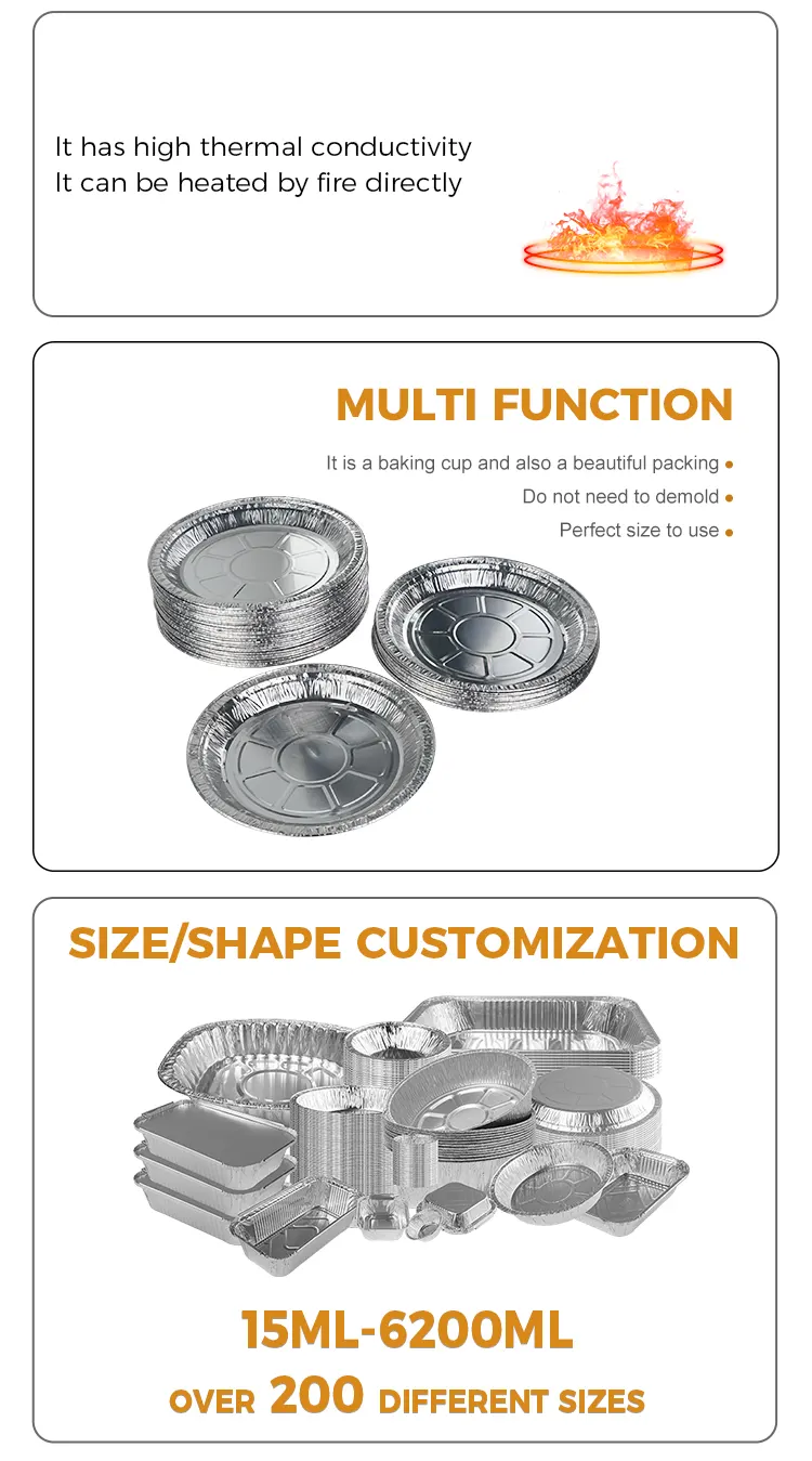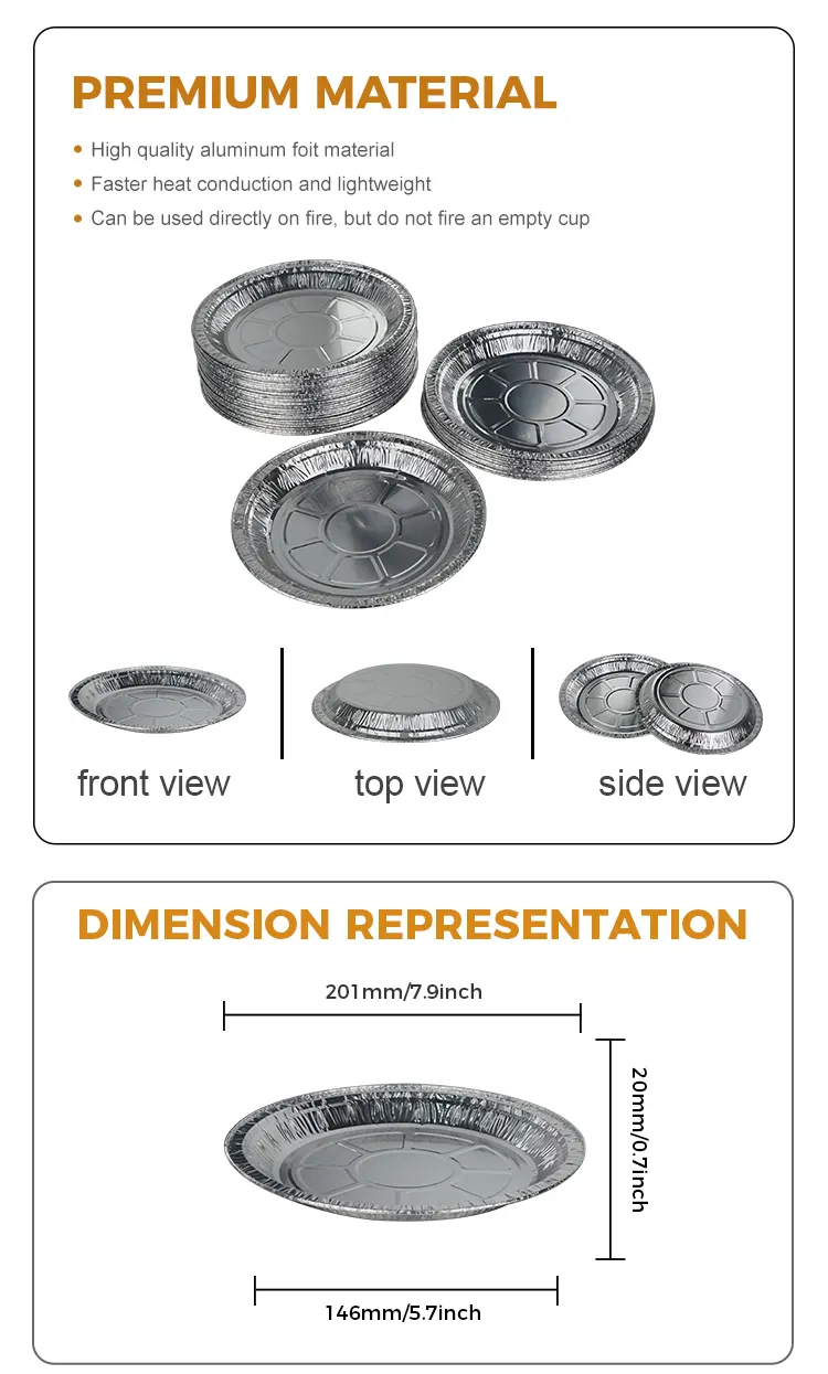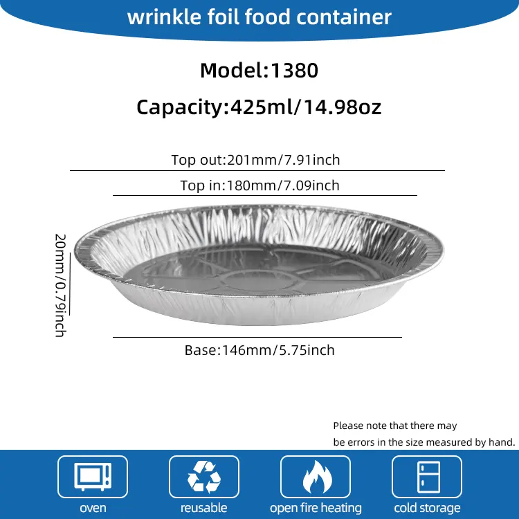 Yunchu Aluminium Foil Disposable Disk Air Fryer Bekas Aluminium Foil Silver adalah kedua-dua kebersihan dan mesra alam. Ia diperbuat daripada bahan yang tebal dan tahan kakisan yang tidak mudah berubah bentuk dan boleh bersentuhan langsung dengan makanan. Ia tidak takut suhu tinggi, tidak terbakar, tidak terbakar, dan tidak mudah dibuang. Ia boleh menahan suhu tinggi sehingga 250°C dan sesuai untuk pelbagai kaedah memasak seperti membakar suhu tinggi, ketuhar dan barbeku, jadi anda tidak perlu risau. Pelbagai spesifikasi tersedia untuk memenuhi keperluan pembakar yang pelbagai dengan saiz yang berbeza, membolehkan anda mengatasi pelbagai keperluan pengeluaran makanan dengan mudah.