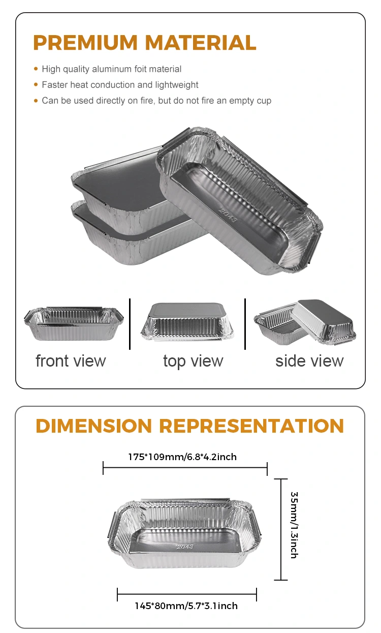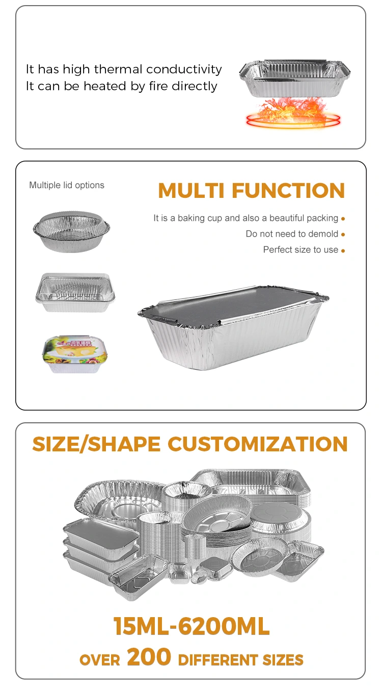 Kotak makanan segera guna barbeku barbeku perak aluminium foil yang diperbuat daripada bahan foil aluminium 8011 yang berkualiti tinggi, yang mempunyai kesan pemeliharaan haba yang baik dan dapat mengekalkan suhu makanan, menjadikan makanan lebih enak dan lazat. Di samping itu, kontena foil aluminium perak BBQ segi empat tepat kami juga dilengkapi dengan fungsi penebat haba, yang boleh dipasangkan dengan tudung foil aluminium atau penutup plastik PET, yang mudah untuk logo tersuai dan meningkatkan lagi imej jenama.