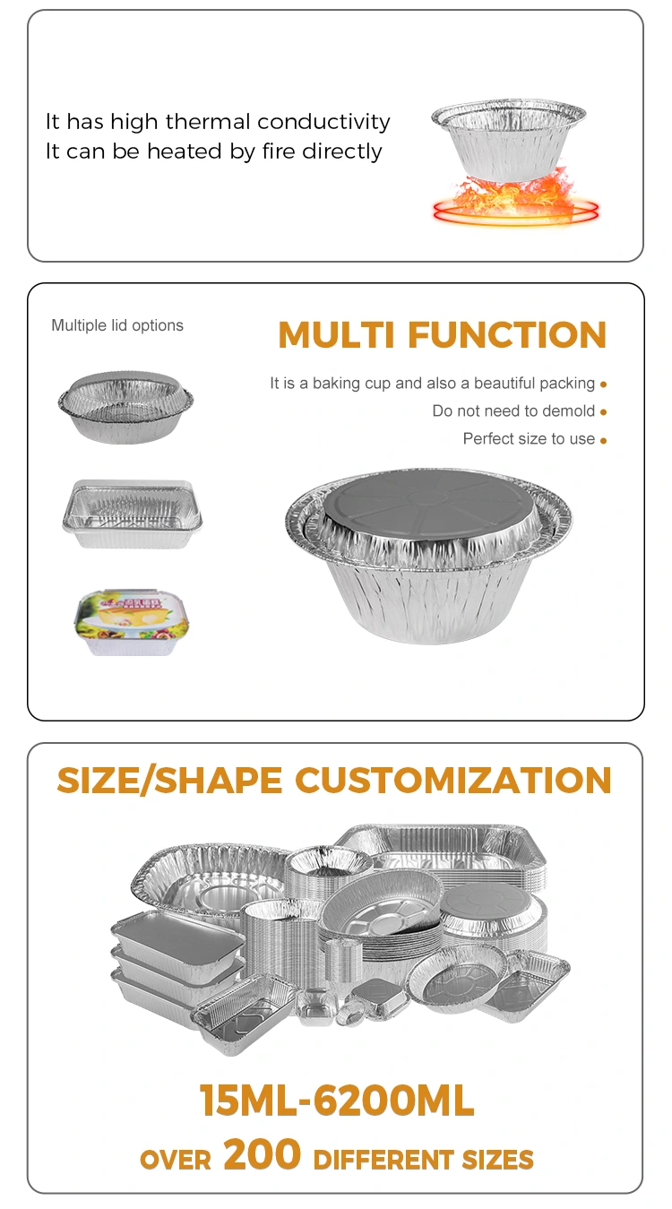 Pembekal foil aluminium yunchu bulat pakej kecil pembakar perak aluminium foil kontena makanan diperbuat daripada bahan kerajang aluminium gred makanan, selepas pemeriksaan pensijilan makanan syarikat, bahan itu menebal, boleh dibuat dengan cabul yang boleh dibuang Kebakaran, ketuhar, ketuhar gelombang mikro, kotak keseluruhan, boleh digunakan di atas api terbuka, bahan tebal dari kotak kerajang aluminium tidak mudah untuk ubah bentuk, produk kotak kerajang aluminium yang digunakan adalah plastik, dan ia akan lebih mudah digunakan apabila menggunakan. Makanan boleh dibuat dalam pelbagai cara untuk memenuhi keadaan pengeluaran anda. Terdapat pelbagai gaya untuk dipilih, untuk memenuhi keperluan pelbagai kegunaan, dua jenis penutup untuk dipilih, tudung foil aluminium yang telus, bahan plastik, tudung telus tidak mudah untuk kabut 1-2 cm lebih tinggi daripada kotak makan tengah hari (tidak boleh digunakan pada suhu tinggi,