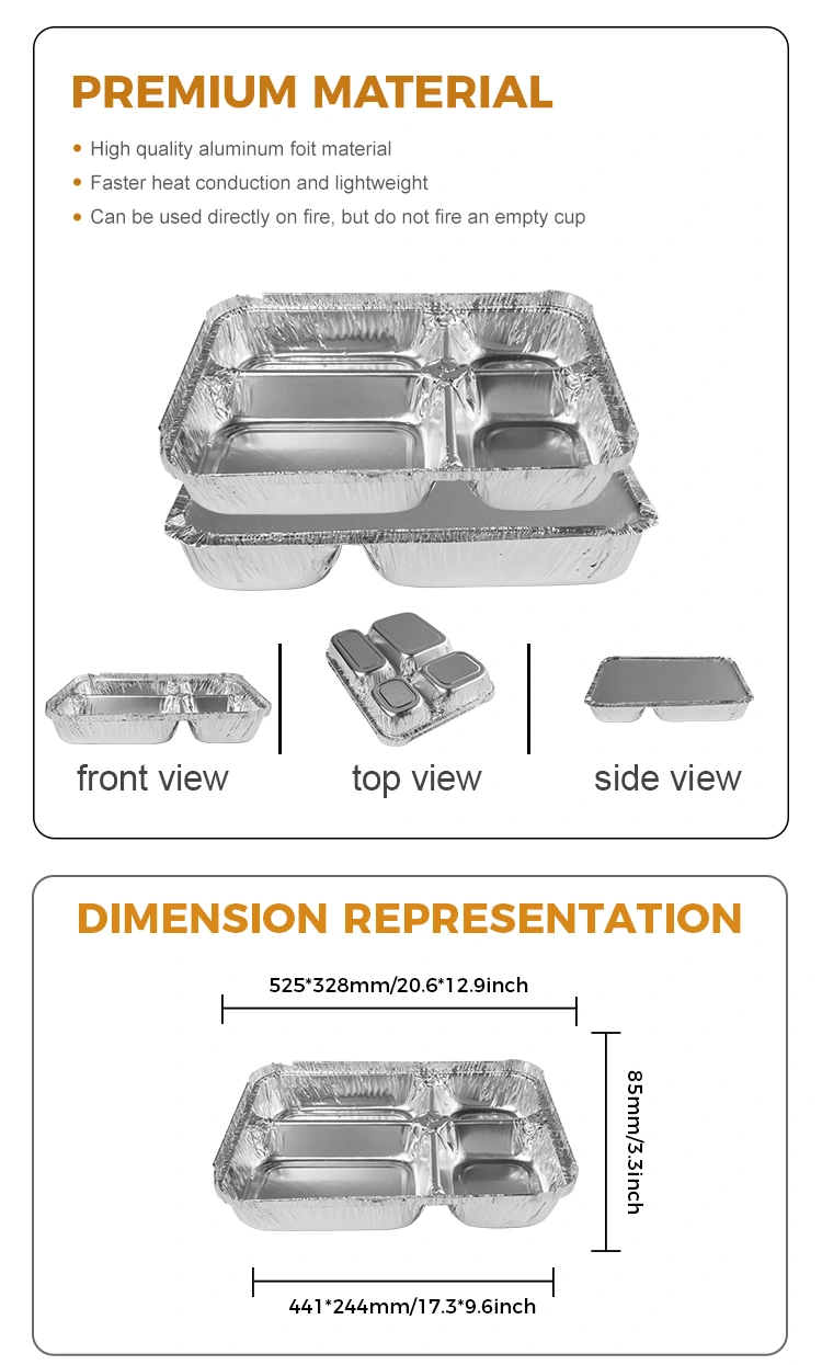 Makanan Multi-Kompar Makanan Segera Dikenakan Silver Aluminium Foil Containerss dengan Lids Kertas berfungsi dengan baik pada musim luruh dan musim sejuk kerana sifat pengekalan haba yang baik. Sama ada rebusan panas yang baru dibuat atau makanan panas yang lain, ia dapat mengekalkan suhu yang sesuai untuk masa yang lama, membolehkan pengguna menikmati makanan panas.