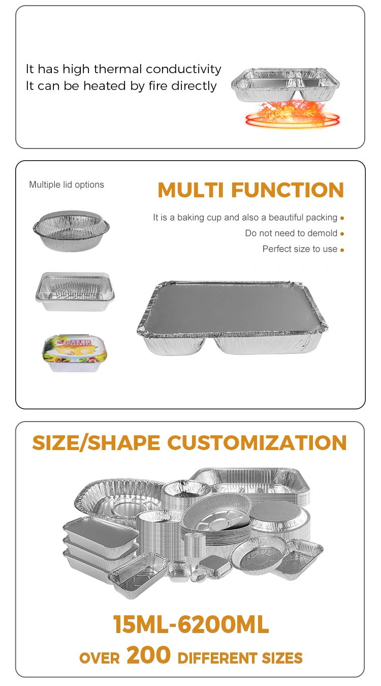 Kotak makan tengah hari aluminium ini bukan sahaja mempunyai sifat penebat haba, tetapi juga boleh dipasangkan dengan tudung kerajang aluminium, meningkatkan lagi kepraktisan produk. Di samping itu, kami juga menyediakan perkhidmatan logo tersuai untuk meningkatkan imej jenama dan meningkatkan mata memori pelanggan.