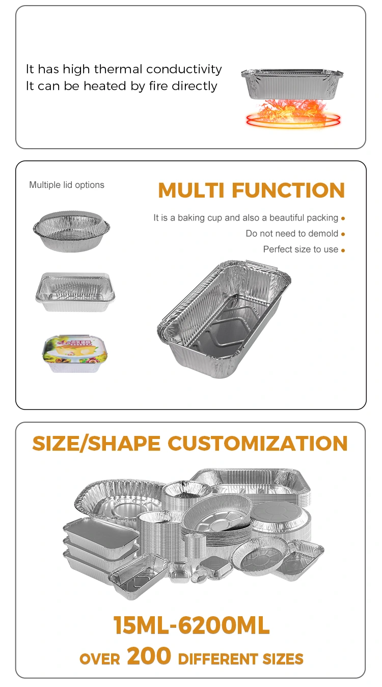 Bekas bakar perak aluminium perak yang boleh dibuang dari pembekal foil aluminium Yunchu adalah alat dapur serba boleh yang sesuai untuk pelbagai kaedah memasak seperti memanggang, periuk panas, gratin, pembungkusan takeaway, dan banyak lagi. Bekas ini cukup padat untuk memenuhi pelbagai periuk dan peralatan, dan datang dalam pelbagai saiz untuk memenuhi keperluan barbeku api terbuka yang berbeza. Ia boleh digunakan untuk membuat pelbagai produk makanan, seperti penggoreng udara dan aplikasi peralatan lain, haba dan rintangan minyak, baking mudah.