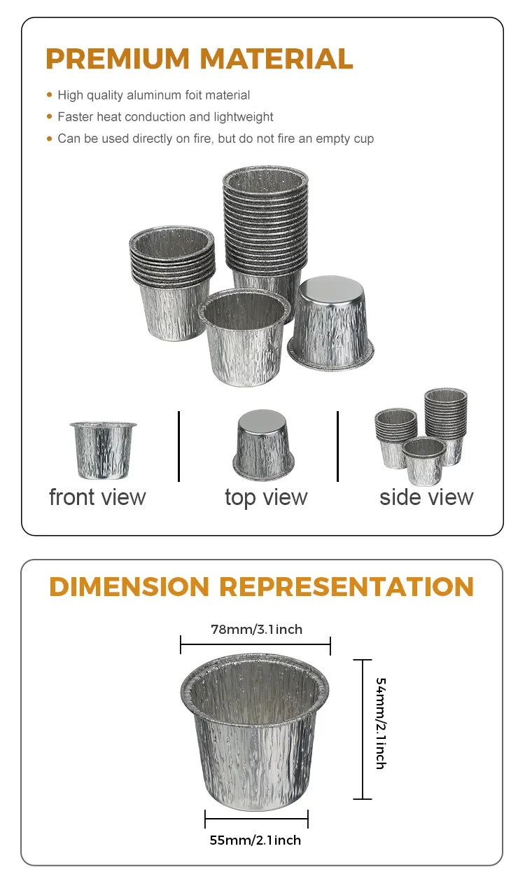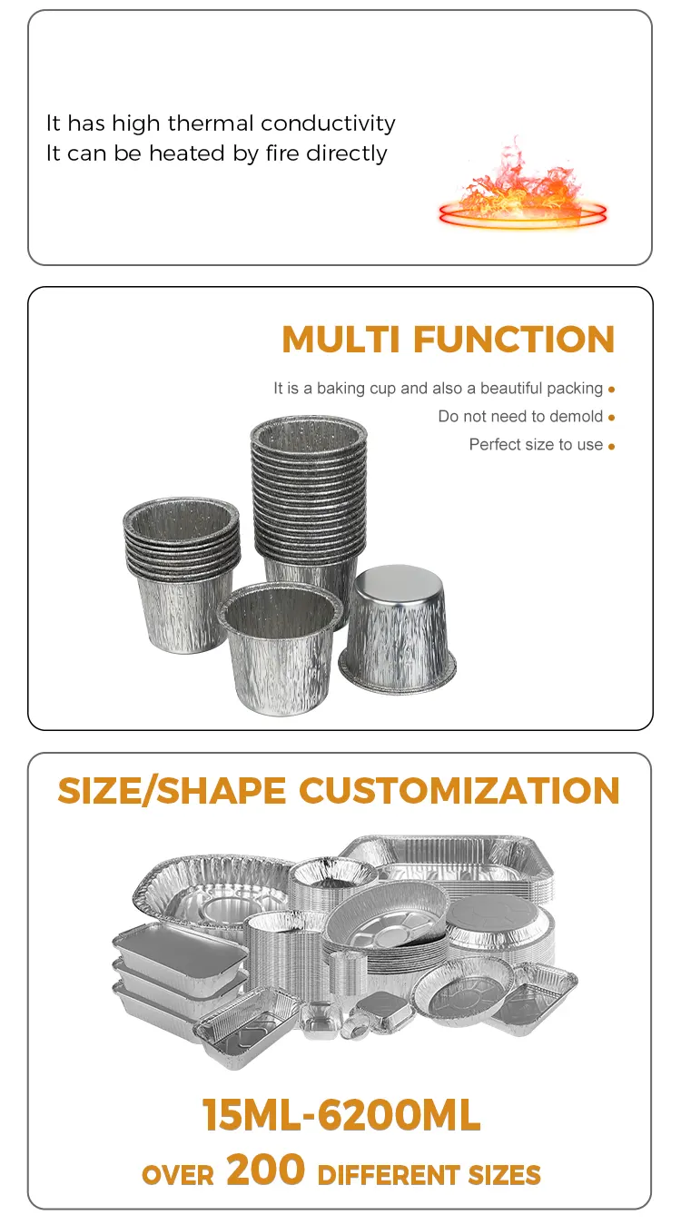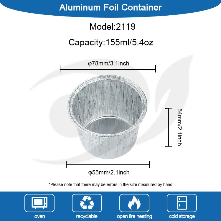 Kerajang Aluminium Yunchu Bekas kek bulat pakai buang bekas kerajang aluminium perak pengilang diperbuat daripada kerajang aluminium ketulenan tinggi gred makanan. Ia telah menjalani ujian kualiti yang ketat dan tidak mempunyai bau dan tiada bahan tambahan yang berbahaya. Sentuhan langsung dengan ramuan memberikan lebih ketenangan fikiran, melindungi setiap gigitan manis dan kesihatan. Proses kerajang aluminium yang menebal menghasilkan badan cawan yang keras yang tidak mudah berubah bentuk atau pecah. Ia boleh digunakan untuk pelbagai adunan kek, mousse, puding dan bahan-bahan lain. Ia boleh menahan suhu tinggi sehingga 250°C dan rintangan suhu rendah sehingga -20°C untuk ketuhar, peti sejuk, penggoreng udara dan peralatan lain. Ia boleh disesuaikan dengan baik untuk membakar, penyejukan dan pembekuan. Tidak perlu menggantikan kotak aluminium foil dan tidak terlalu banyak langkah yang membosankan. Reka bentuk bulat klasik, badan cawan adalah bulat dan licin, dan kilauan logam perak yang sepadan tidak memerlukan hiasan tambahan. Ia boleh dihidangkan terus selepas dibakar dan ia akan mempunyai kesan persembahan peringkat kedai pencuci mulut. Mulut cawan digulung halus, menjadikannya licin untuk disentuh dan tidak menggaru tangan anda. Ia menghalang adunan daripada bocor apabila dituang, dan memudahkan proses penyahculikan.
