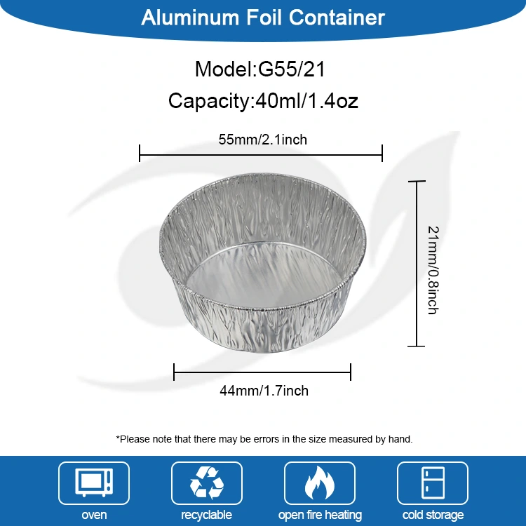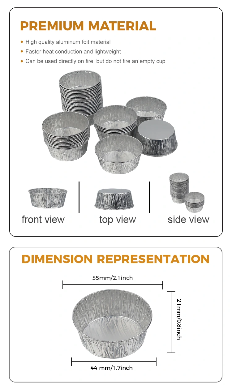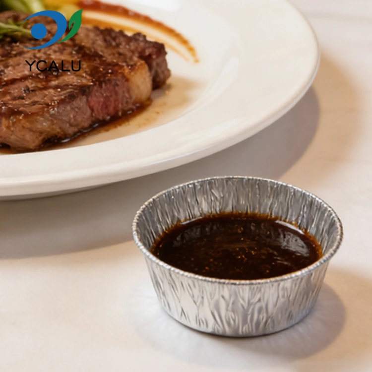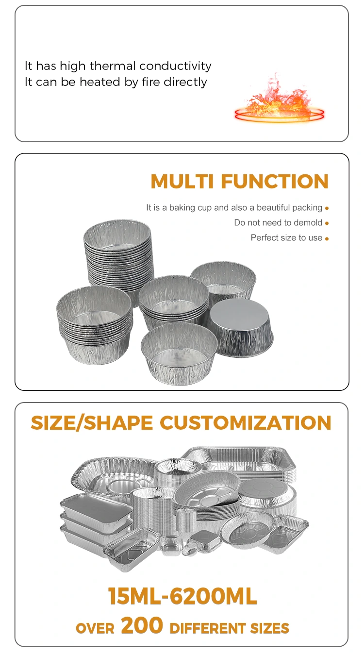 Bekas kerajang aluminium perak pakai buang Pembekal Yunchu Aluminium Foil Penggoreng udara celup bulat perak diperbuat daripada kerajang aluminium pekat gred makanan. Ia selamat, tidak berbau dan tidak mempunyai kerpasan berbahaya. Ia boleh terus menghubungi semua jenis bahan celup. Bekas aluminium foil kecil ini boleh disusun untuk menjimatkan ruang, tidak cacat, dan tidak bocor. Kerajang aluminium perak mempunyai tekstur seragam dan kekonduksian terma yang sangat baik. Ia boleh digunakan di restoran, kafe, perhimpunan keluarga, dsb. Ia digunakan dengan snek dalam penggoreng udara, dsb. Walaupun ia mengandungi sos pekat dan sos pencicah berminyak, ia tidak akan bocor. Ia memastikan meja dan peralatan dapur sentiasa bersih dan kemas. Persembahan kerajang itu ringkas dan cantik dalam pelbagai adegan. Penampilan perak boleh dipadankan dengan pelbagai pinggan makan.
