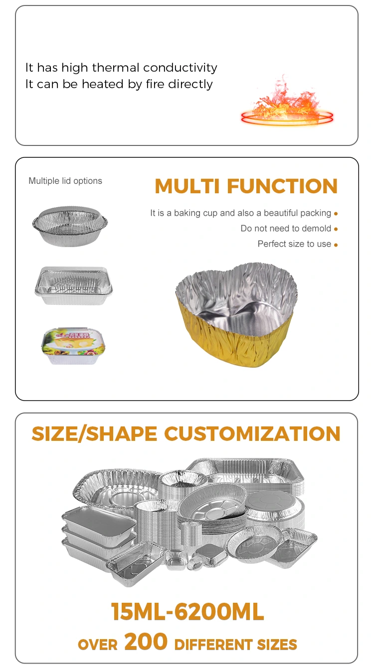 Produk ini disesuaikan oleh kilang Yunchu, berbentuk mini-bakar perak aluminium foil yang berbentuk hati terbuat dari bahan kerajang aluminium perak, model J35-16. Ia sesuai untuk sebahagian kecil makanan, seperti makanan ringan dan jeli, untuk memenuhi keperluan pengguna moden untuk pelbagai makanan dalam bahagian kecil. Ia sangat mudah apabila dinikmati bersendirian atau dirasai oleh satu orang.