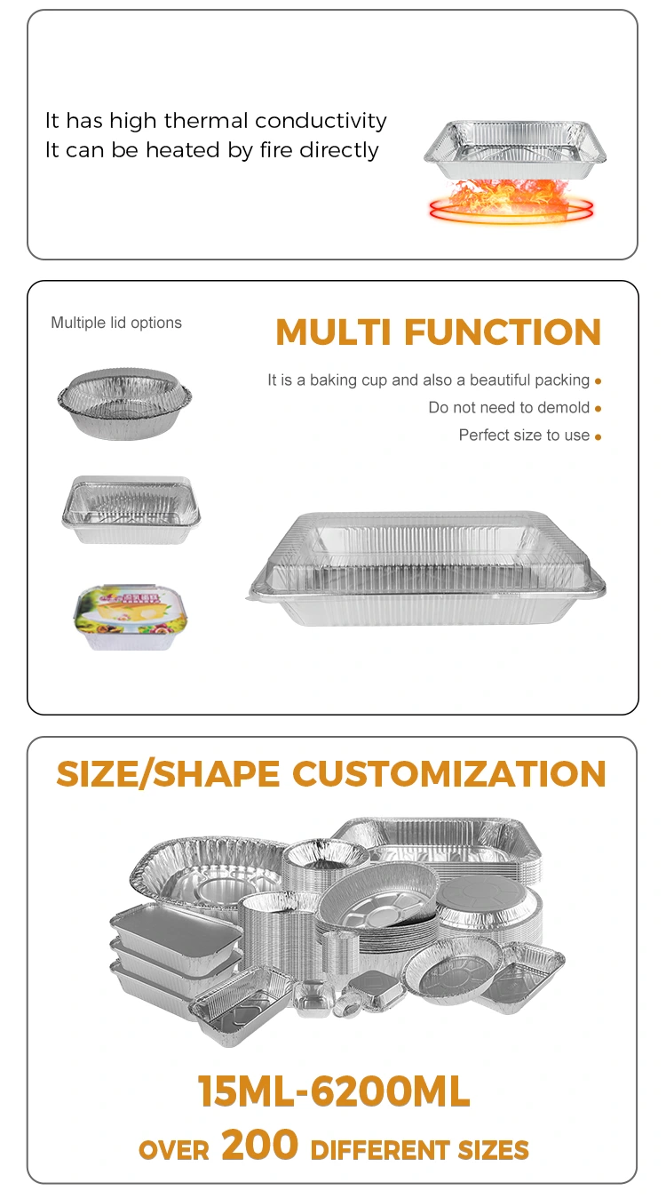 Ciri-ciri: Kapasiti besar ini Baking Pan Silver Foil Container diperbuat daripada bahan foil aluminium 8011-0, yang sepenuhnya memenuhi standard hubungan gred makanan, memastikan keselamatan makanan tanpa bau yang aneh, dan lebih yakin untuk digunakan. Ia mempunyai reka bentuk dalaman cekung dan cembung, yang lebih selamat digunakan. Peralatan ini bebas daripada membersihkan dan melindungi pelapik peralatan dengan baik. Sama ada baking atau pemanasan di atas api terbuka, tidak perlu bimbang tentang ubah bentuk kontena atau menjejaskan keselamatan makanan.