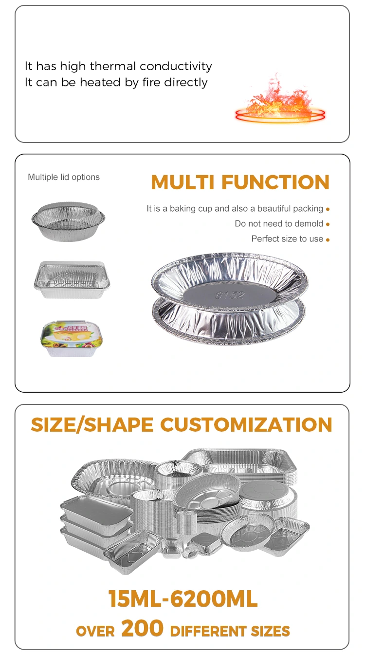 Ciri-ciri: Satu keping pencetakan menebal dan tahan bakar, mengamalkan bahan foil aluminium sentuhan makanan, yakin untuk menghubungi makanan, tidak mudah untuk ubah bentuk dan tidak bocor, ketebalan yang kuat, ketahanan kakisan, rintangan suhu tinggi.