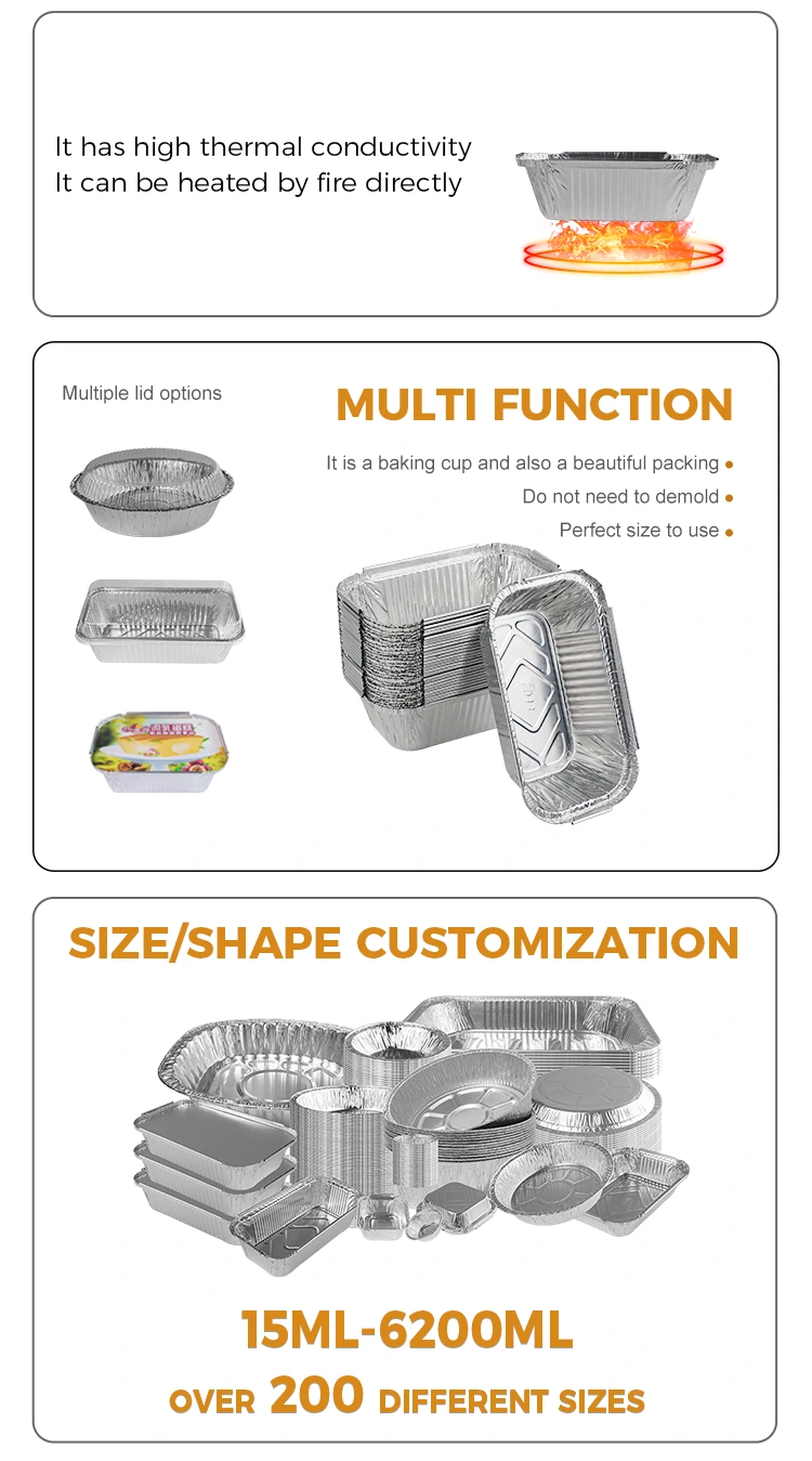 Ciri -ciri: Kotak makan tengahari aluminium yang kami sediakan diperbuat daripada bahan foil aluminium 8011, yang mempunyai prestasi pemeliharaan haba yang sangat baik dan dapat mengekalkan suhu makanan dengan berkesan, menjadikan makanan anda lebih menarik. Khususnya, kontena foil aluminium beras segi empat tepat kami bukan sahaja mempunyai sifat penebat haba, tetapi juga boleh digabungkan dengan penutup aluminium foil atau penutup plastik PET untuk memudahkan penyesuaian logo yang diperibadikan, dengan itu meningkatkan titik memori pelanggan dan meningkatkan kesedaran jenama.