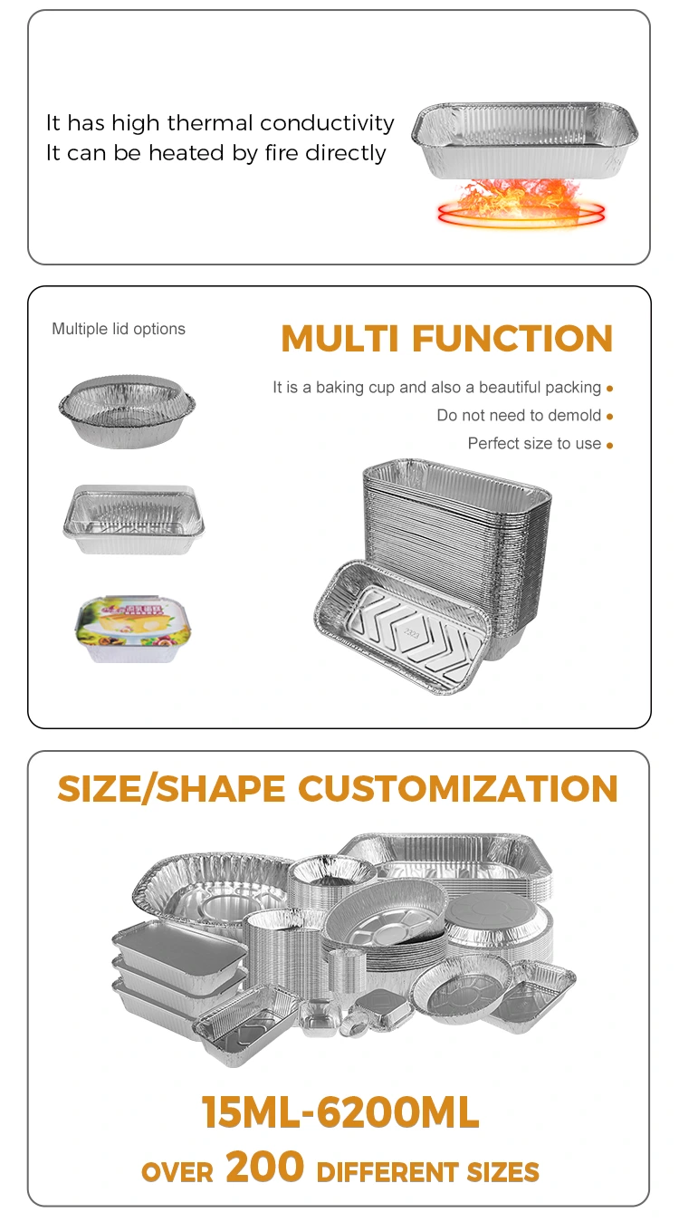 Ciri -ciri: Kotak makan tengah hari borong 8011 bahan kerajang aluminium diperbuat daripada pemeliharaan haba yang baik, yang dapat mengekalkan suhu makanan dan menjadikan makanan lebih enak. Di samping itu, kontena foil aluminium perak barbeku segi empat tepat kami juga mempunyai fungsi pemeliharaan haba, yang boleh dipadankan dengan tudung kertas kerajang aluminium dan penutup plastik PET, yang mudah untuk anda menyesuaikan logo anda, lebih mendalamkan kesan pelanggan, dan meningkatkan imej jenama anda.