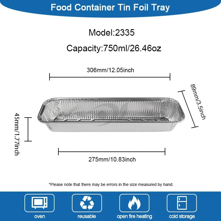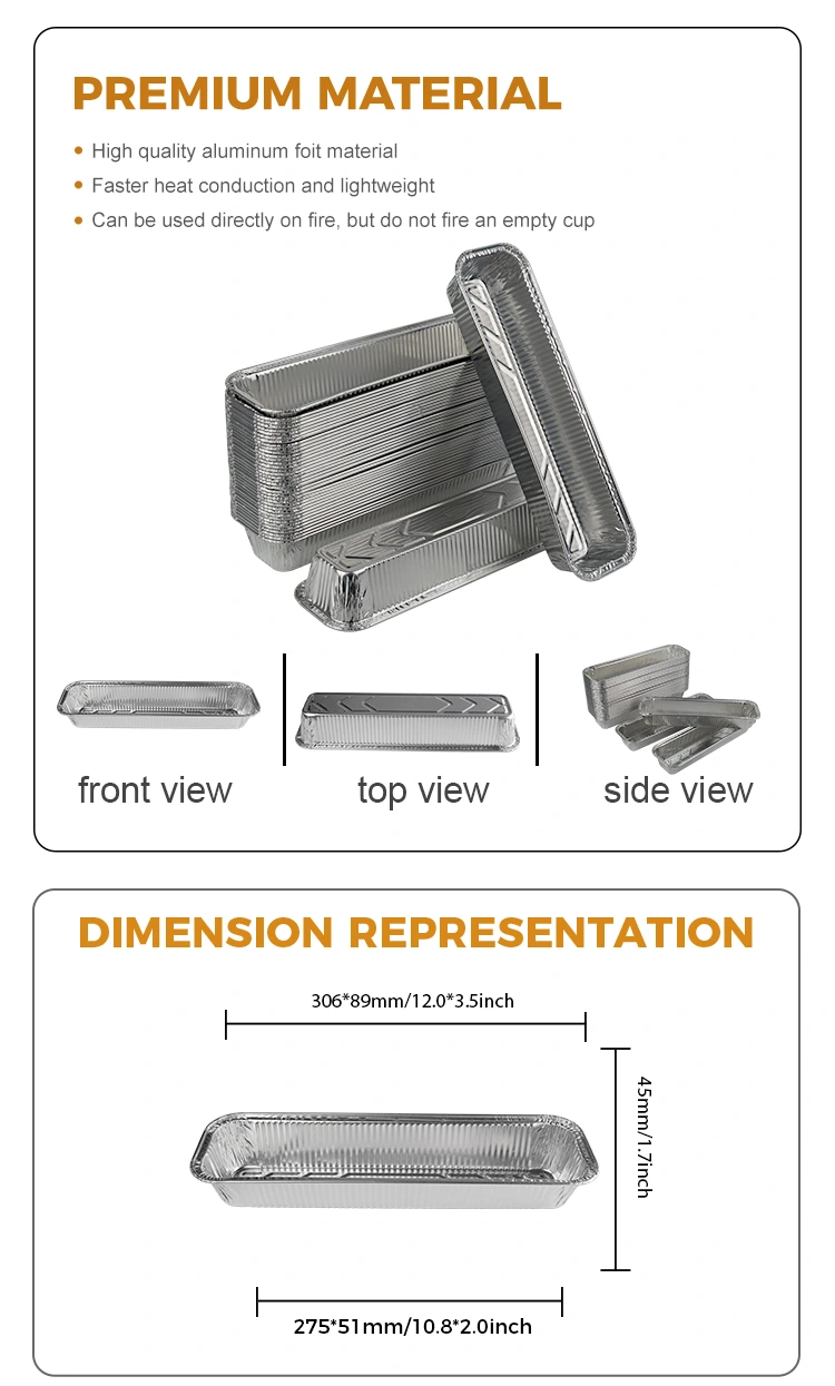 Dulang roti segi empat tepat ini membakar bekas kerajang aluminium perak menjalani ujian kualiti yang ketat untuk memastikan tiada bahan berbahaya yang dikeluarkan semasa pemanasan api terbuka, dan pengguna tidak perlu bimbang tentang isu keselamatan. Di samping itu, reka bentuk yang mesra alam dan tahan lama bukan sahaja memastikan pengangkutan produk yang selamat tetapi juga mengekalkan penampilan terbaik. Reka bentuk cekung dan cembung di bahagian bawah meningkatkan sifat anti-slip produk, manakala pengetuk tambahan di sisi meningkatkan kekerasan produk. Reka bentuk hemming menebal dan mendalam, dengan rintangan suhu tinggi yang baik dan kekonduksian terma, yang dapat mencapai pemanasan seragam dan tidak ada bau yang aneh, menjadikannya sangat sesuai untuk digunakan dalam pelbagai senario seperti panggang arang, roti panjang, dan penghantaran tongkat.