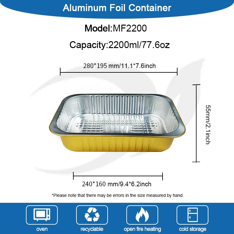 Bekas foil aluminium emas segi empat tepat MF2200 Diameter atas adalah 278*195 mm (10.9*7.6inches), diameter bawah adalah 240*160 mm (9.4*6.2 inci), ketinggian adalah 55 mm (2.1 inci), dan kapasiti adalah kira -kira 2200 ml (77.6 oUces (77.6 eNSE.