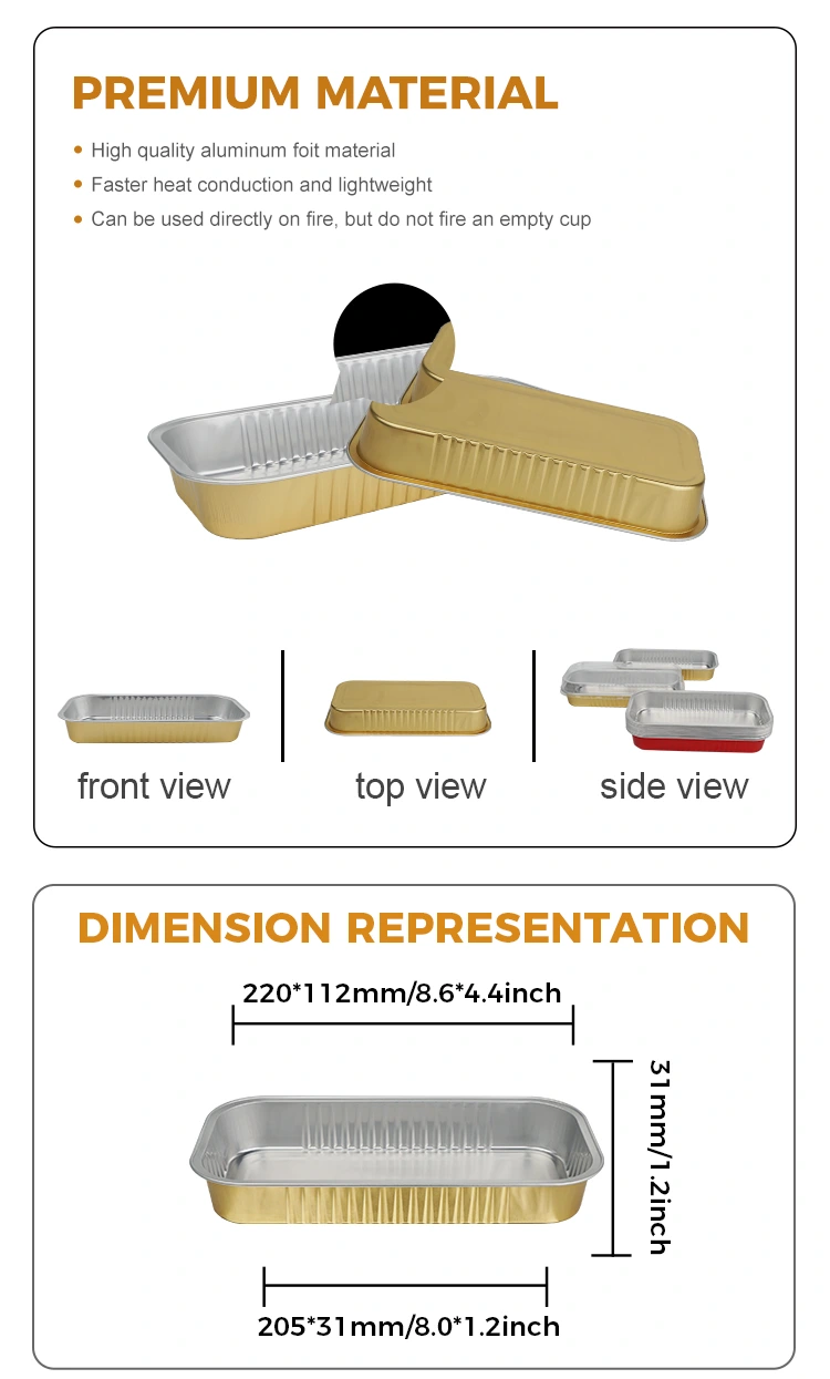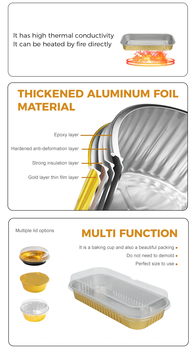 Foil aluminium Yunchu menyediakan kontena aluminium aluminium bakar emas segi empat tepat, yang bukan sahaja sesuai untuk senario penaik tetapi juga untuk mengambil, dan juga dapat membantu anda dengan penyimpanan harian: