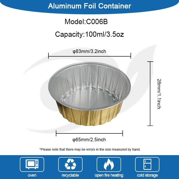 Pembekal foil aluminium yunchu pembekal bulat gelas penaik smoothwall aluminium foil container C006B adalah mousse kecil dan sederhana, barang-barang buatan yang disesuaikan dengan barang-barang pembungkusan aluminium, kapasiti sentiasa ada, sangat sesuai untuk, kek keju, kek mousse, tiramisu, puding jeli, pasta dan penggunaan pembungkusan makanan lain. Berbanding dengan cawan foil aluminium berkapasiti kecil yang sering dilihat, reka bentuk 100ml dapat menyediakan ruang yang sangat kaya, yang sangat sesuai untuk kedai kopi, menjual pencuci mulut, dan menjadikannya mudah bagi pengguna untuk membeli dan makan segera.