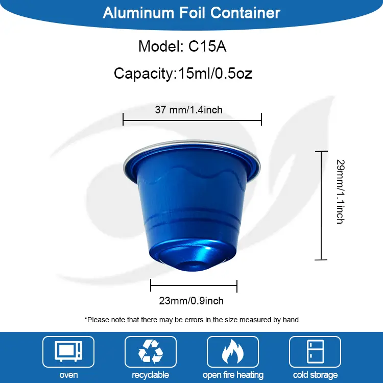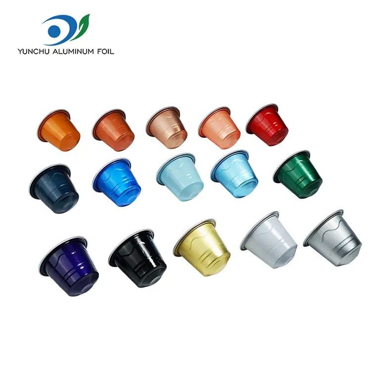 Pembekal foil aluminium Yunchu menawarkan kapsul kopi kosong silikon conical-seal yang sesuai untuk kebanyakan mesin kapsul kopi, yang boleh digunakan untuk membungkus cecair espresso, dan juga memanjangkan hayat rak oleh nitrogen flushing. Di samping itu, logo dan warna boleh disesuaikan, dan corak boleh dicetak pada meterai foil aluminium, dan logo stamping juga boleh dilakukan di bahagian bawah kapsul kopi. Dimensi kapsul adalah seperti berikut: diameter atas 37mm (lebih kurang 1.4 inci), diameter asas 23mm (lebih kurang 0.9 inci), ketinggian 29mm (lebih kurang 1.1 inci).
