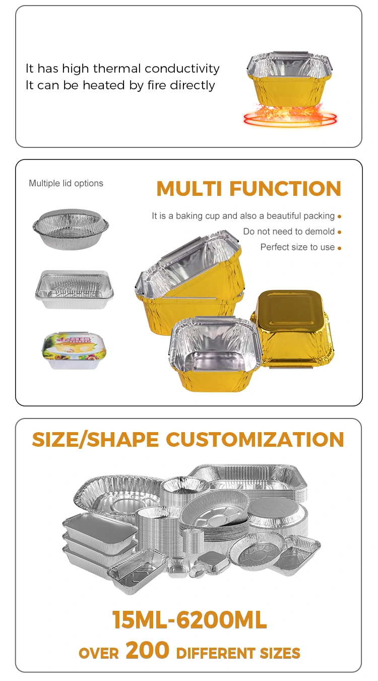 Bekas bakar perak ketuhar perak yang disediakan oleh pembekal foil aluminium Yunchu adalah kontena foil aluminium dapur yang sesuai untuk membuat kek persegi, membakar cookies, memanggang, dan memasak di dalam penggoreng udara. Bukan sahaja ia mempunyai kapasiti sederhana (95ml) yang dapat dengan mudah memegang kebanyakan makanan, tetapi ia juga dilengkapi dengan penutup foil haiwan kesayangan yang telus untuk memelihara debu dan bahan cemar lain. Reka bentuk permukaan licin menjadikan bekas mudah disusun dan disimpan, menjimatkan ruang dapur yang berharga.